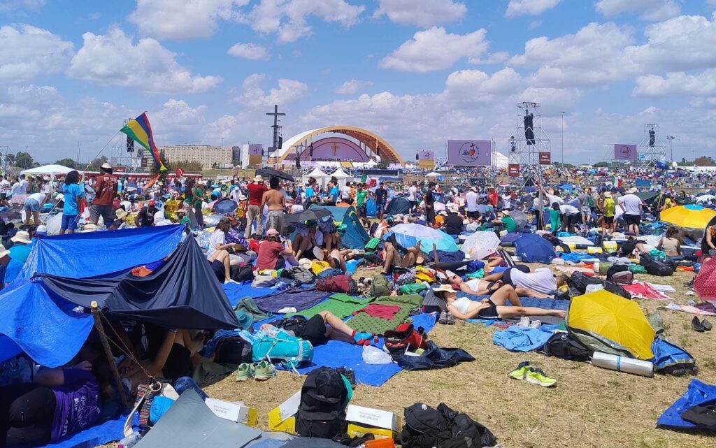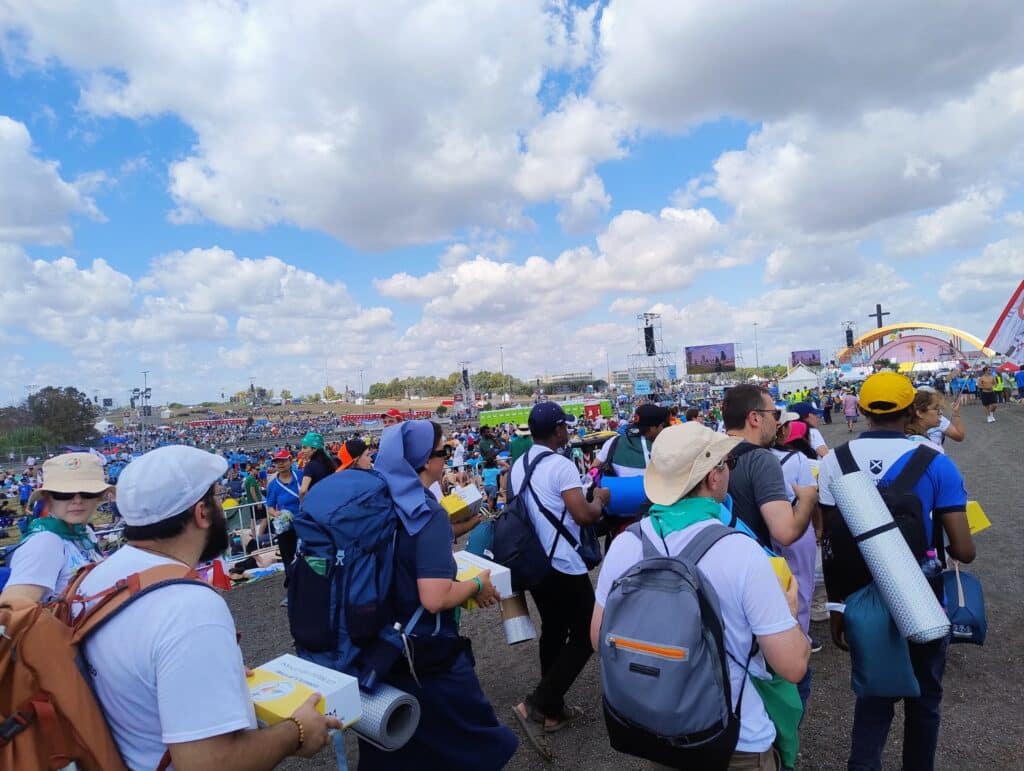 Through the pilgrims, I witnessed God at work in many ways and parts of the world. Lively groups of young people would stop by our camping area to converse, trade souvenirs, ask for a signature, and sometimes, request prayers. Their joy and openness struck me. I remember a group from Spain approaching me for prayers for their catechetical ministry and outreach. Their dedication to encourage other young people in the faith was inspiring. As they shared, I realized I would probably not see them or most of the million pilgrims again.
